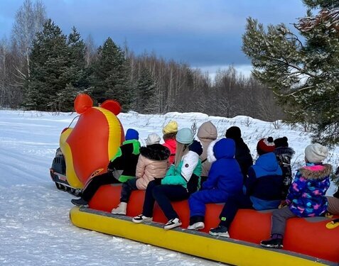 В программе: путешествие в Димитровград, где вас ждет катание на ватрушках, 18 горок на любой вкус, специально оборудованный тир, путешествие по заснеженному зимнему лесу на 7-ми метровом турбо-банане, аниматоры, фотосессия с северными оленями.